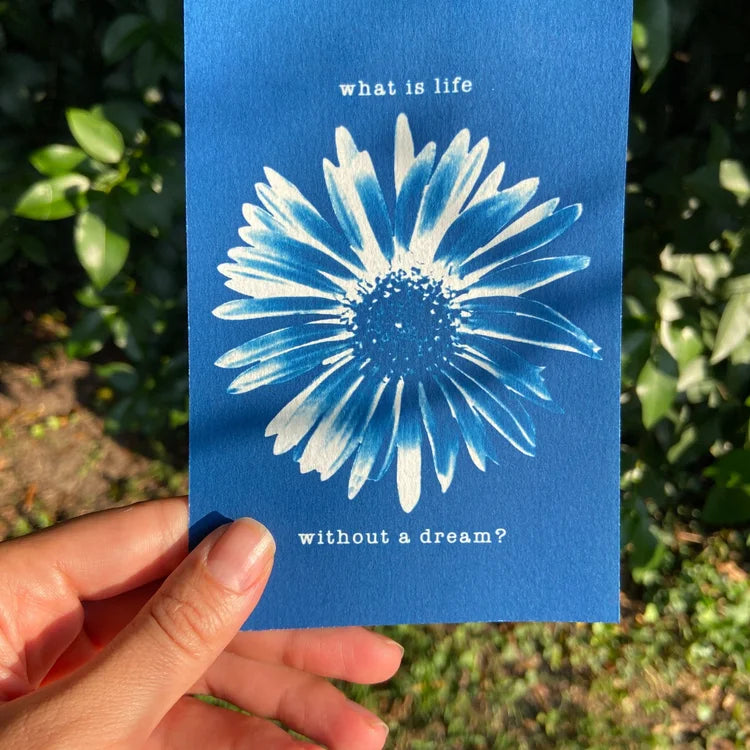 Cyanotype: Also known as "sun printing" is a photographic technique that begins by mixing water, potassium ferricyanide, and ferric ammonium citrate. Once a surface is coated with this chemical mixture, it is exposed to the sun or a UV light under objects (such as pressed flowers/leaves) or a photographic negative. Any part that is exposed to the rays will turn a bright prussian blue. Discovered in 1842, this is one of the earliest photographic techniques.
