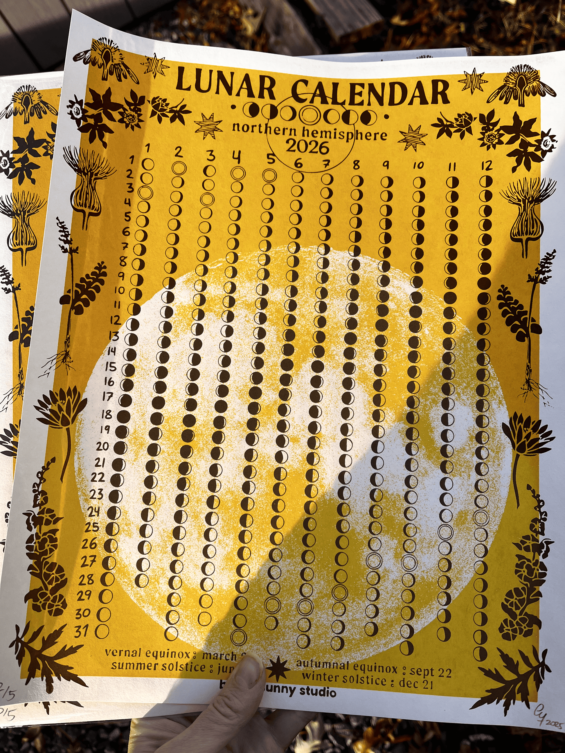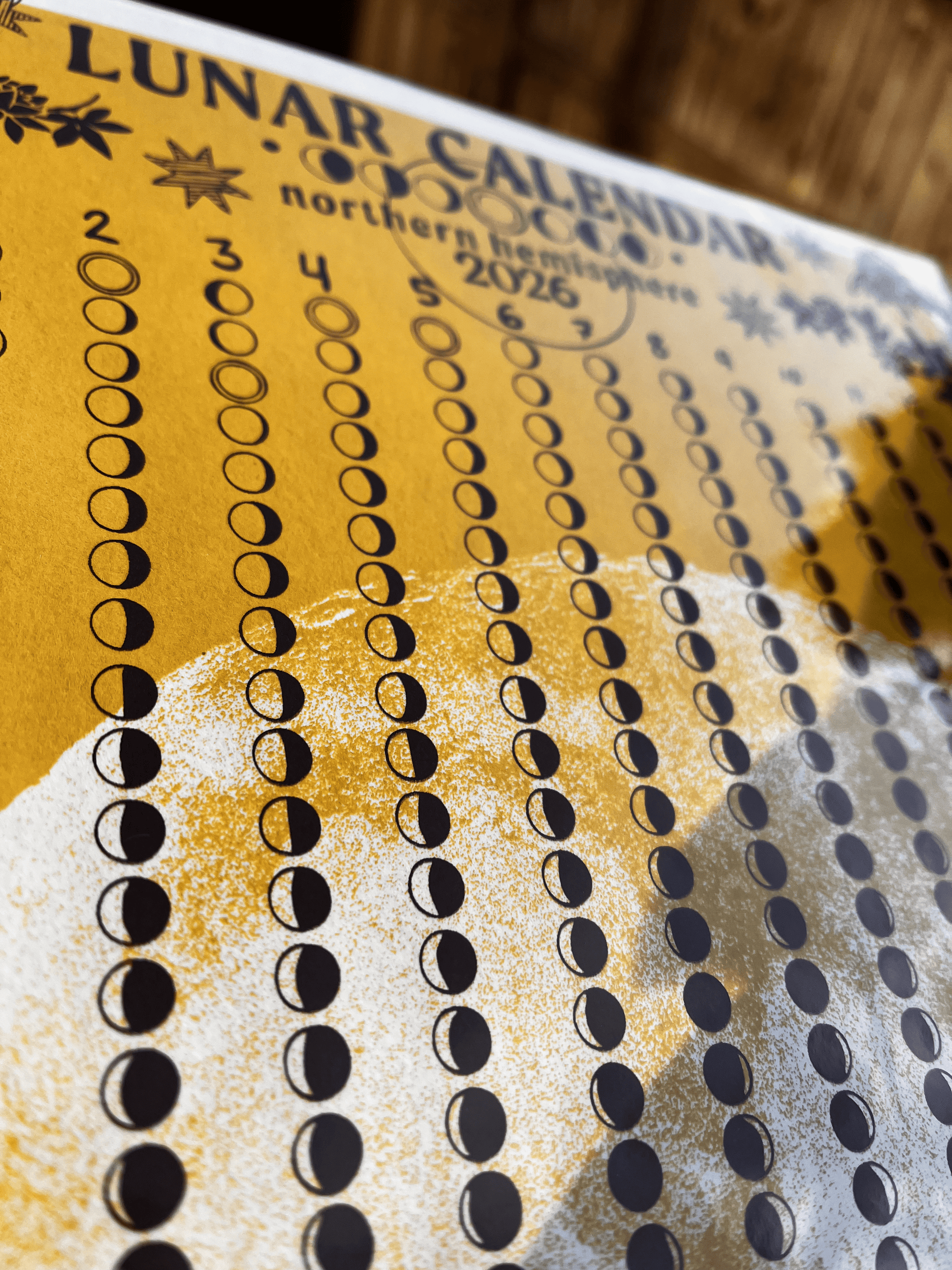A 2026 Lunar Calendar for the northern hemisphere, including solstice and equinox dates. Celebrate the magic of the moon all year long with this stunning print, a perfect blend of celestial beauty and mystical charm. This limited edition series has been hand-drawn with intricate detail and screen printed on high-quality, acid-free paper.