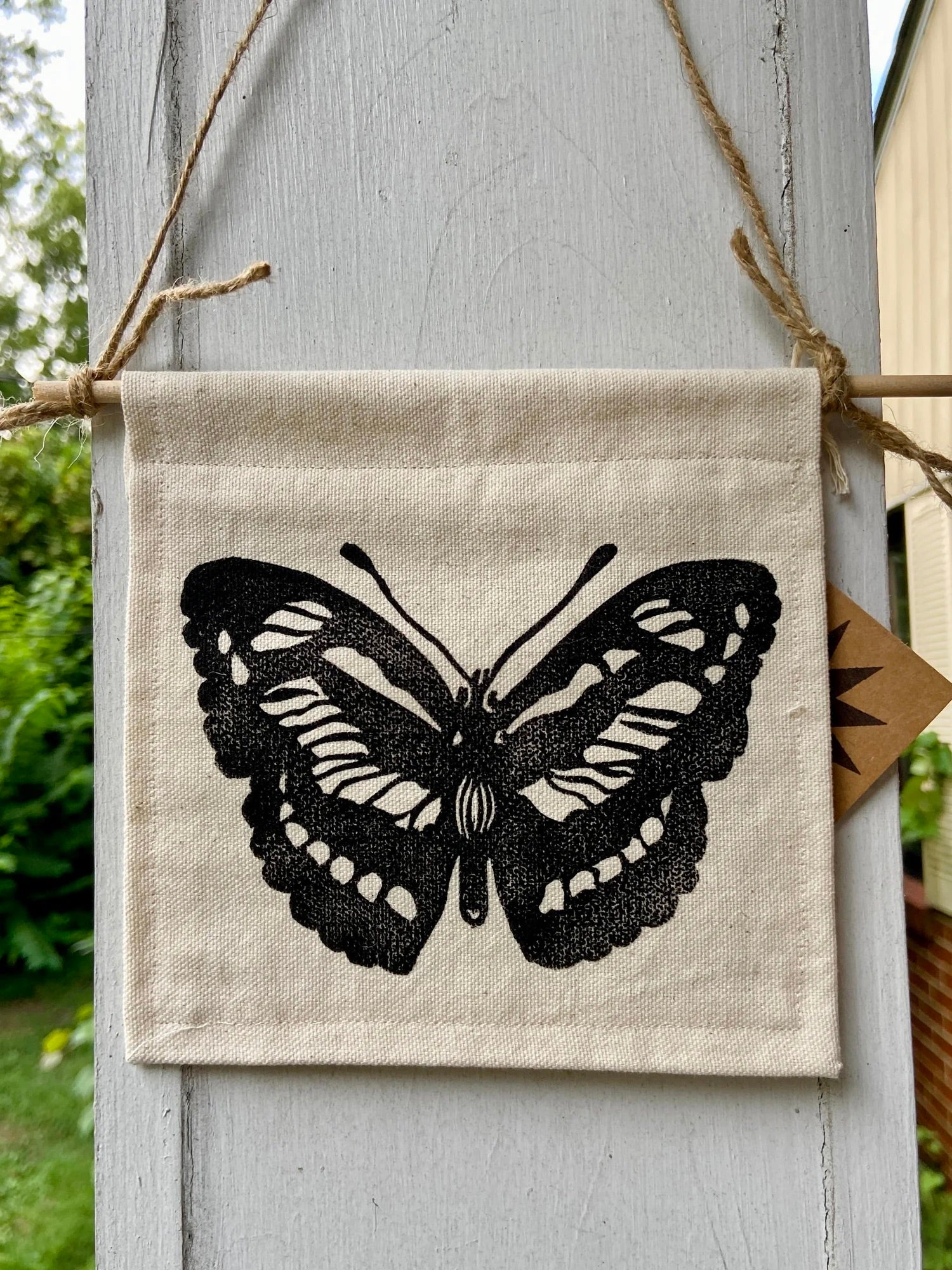This hand-printed wall pendant brings the magic of butterflies to any space. The design is printed on durable canvas with hand-sewn finished edges to prevent fraying, making it perfect for indoor or outdoor display.