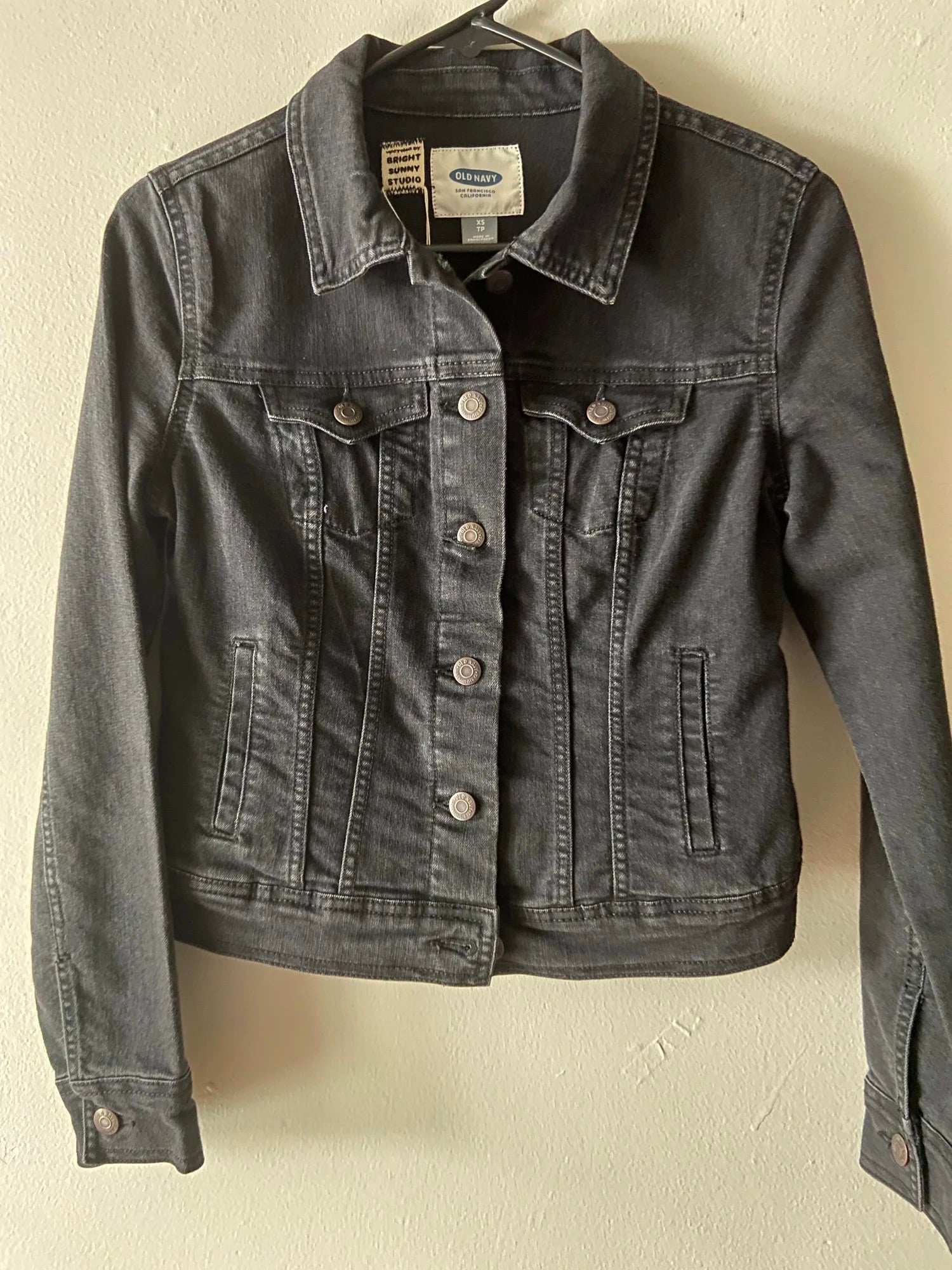Black denim jacket featuring a block printed flower patch on the back. The patch is made from beige linen and stamped with high quality washable ink. Care instructions are included with each item.