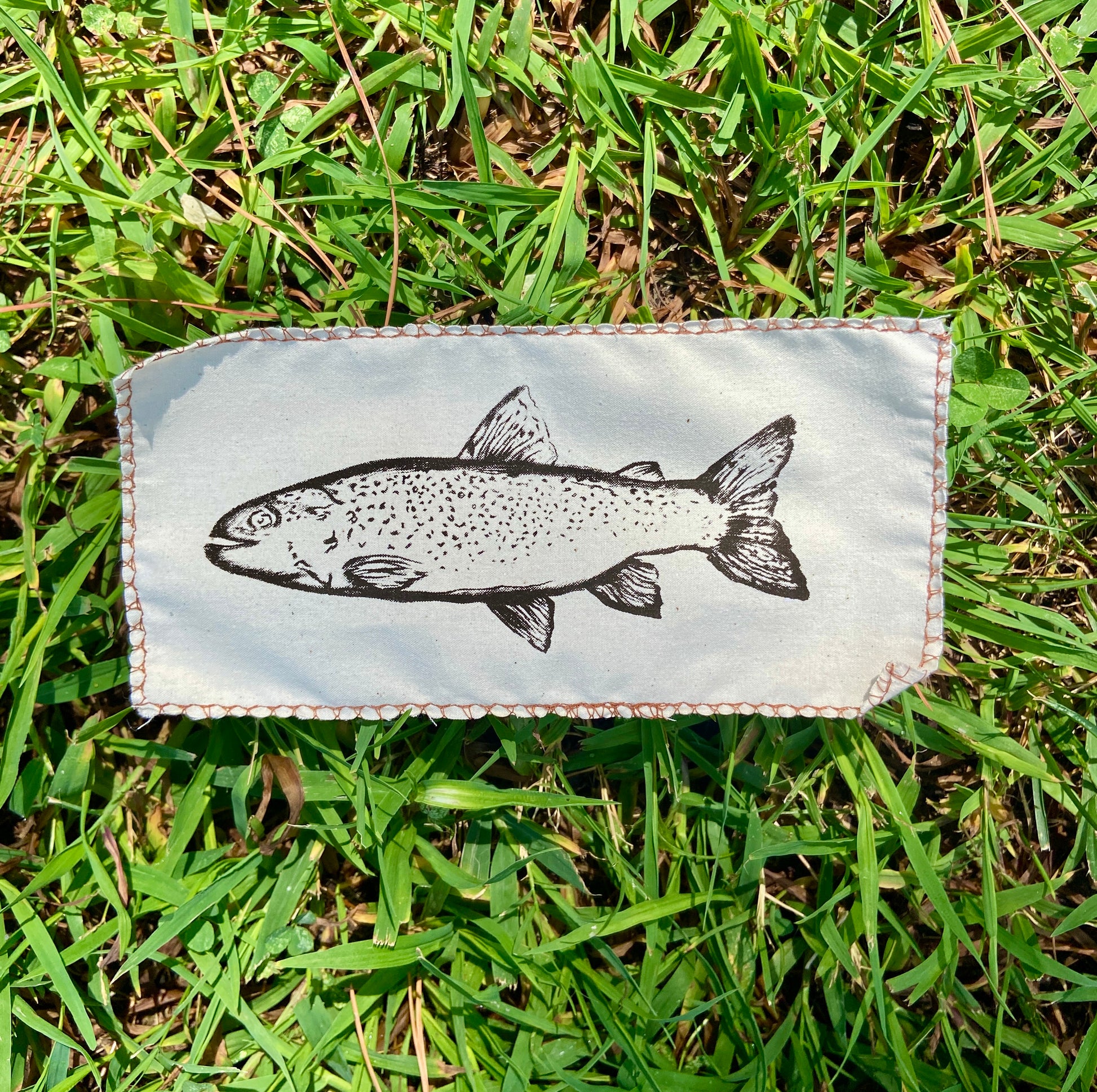 This hand-printed patch series features a hand-drawn brown trout. Each patch is made from thick cotton muslin material that has a finished stitched edged and measures approximately 4”x7”. The design is screen-printed with eco-friendly, durable water-based ink.