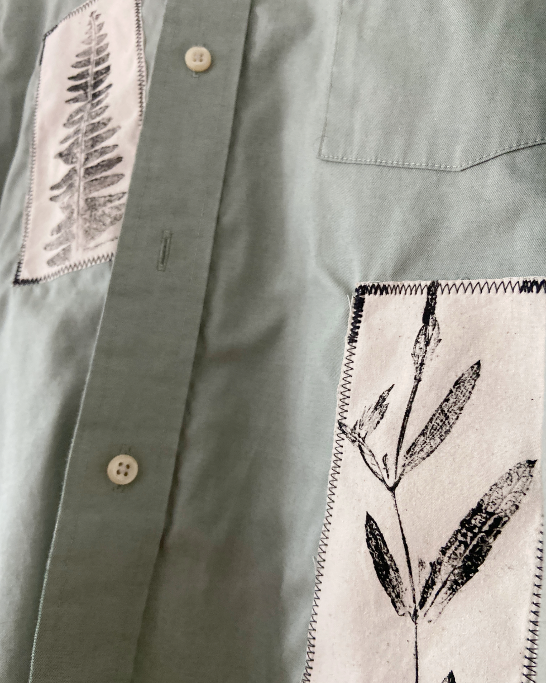 Pale green button-down shirt featuring a leaf-printed patches.