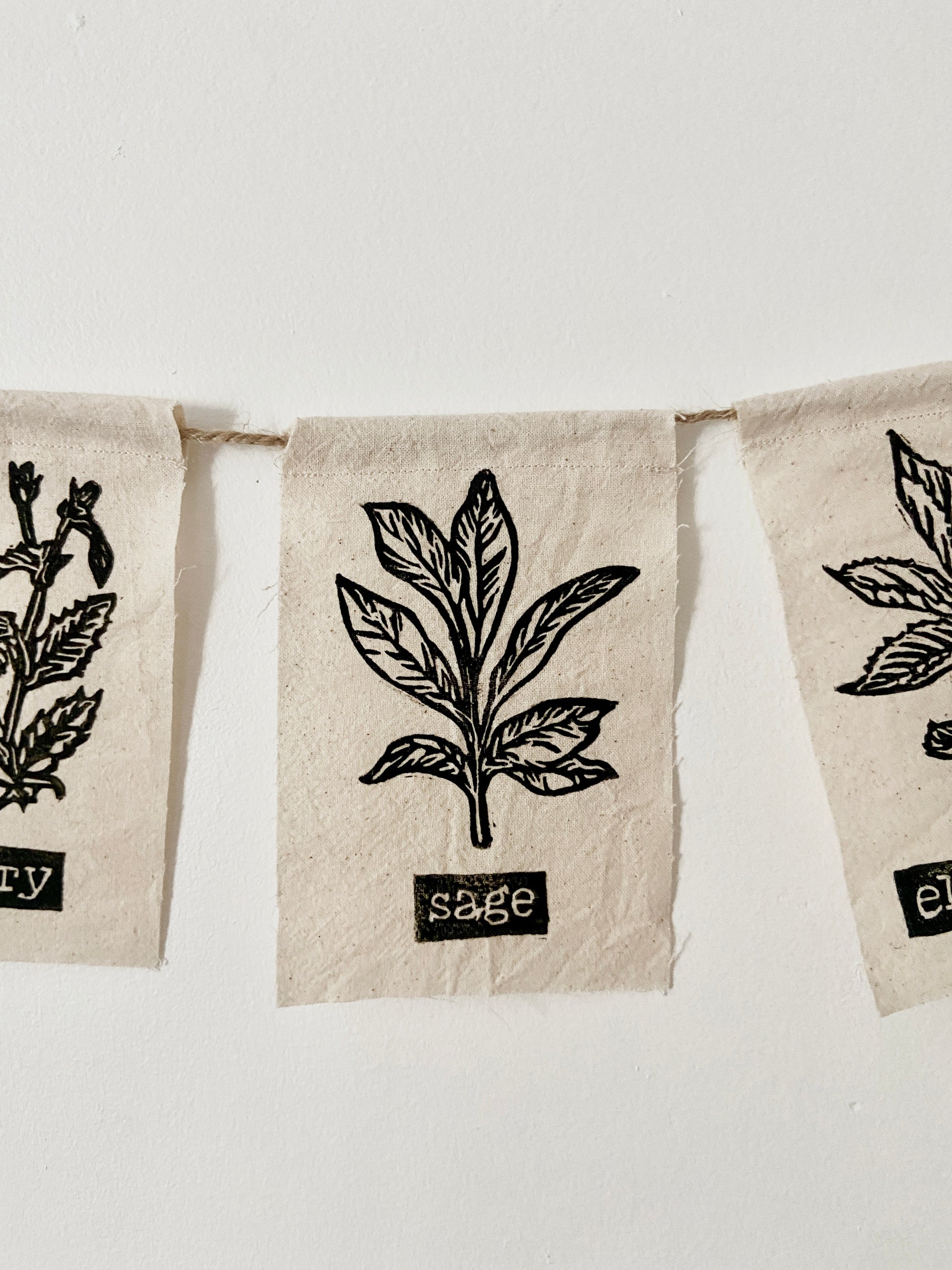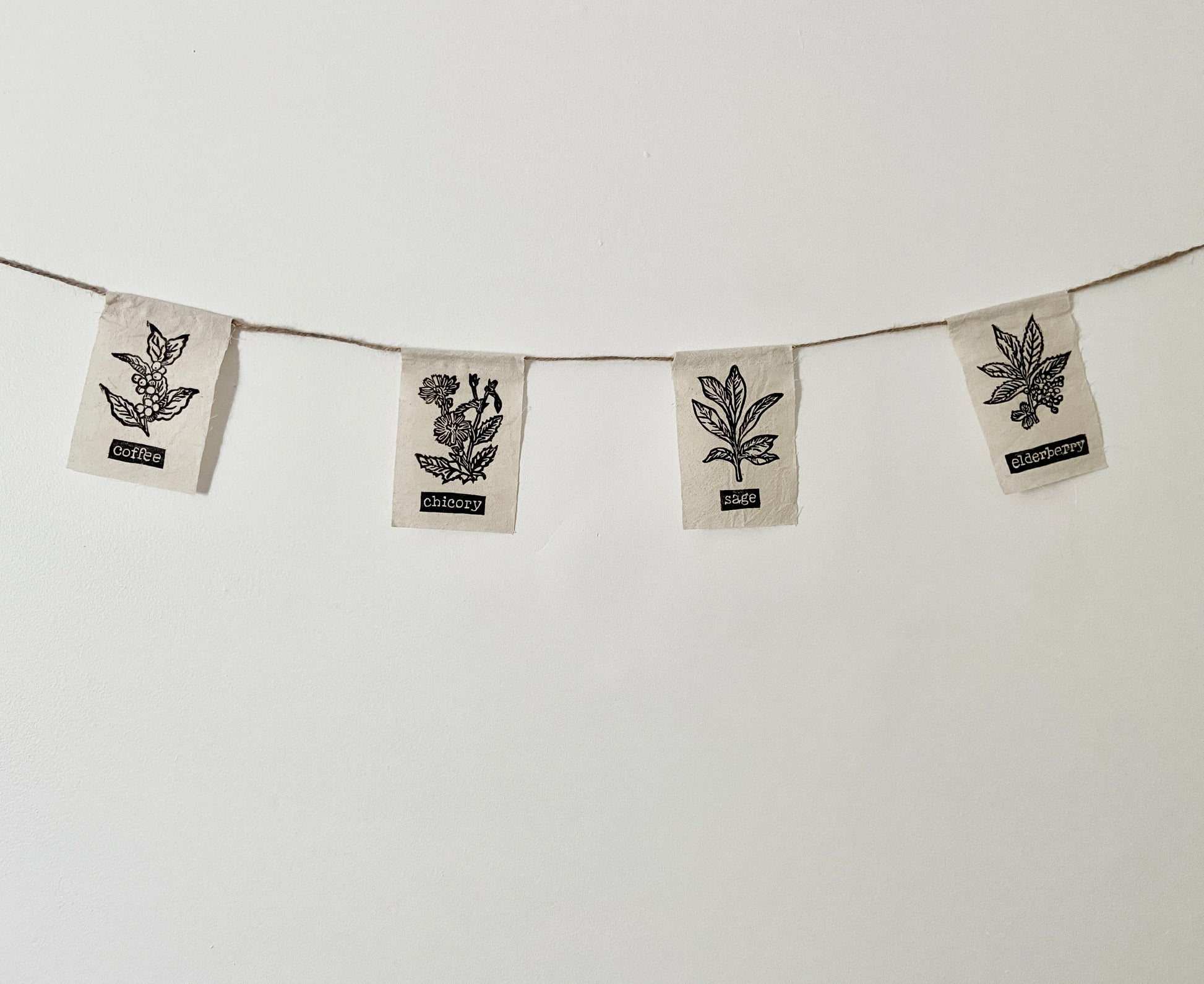 This hand-printed string of flags features four herbs block printed with black ink on a natural muslin fabric that does not fray. The flags hang on natural jute string.