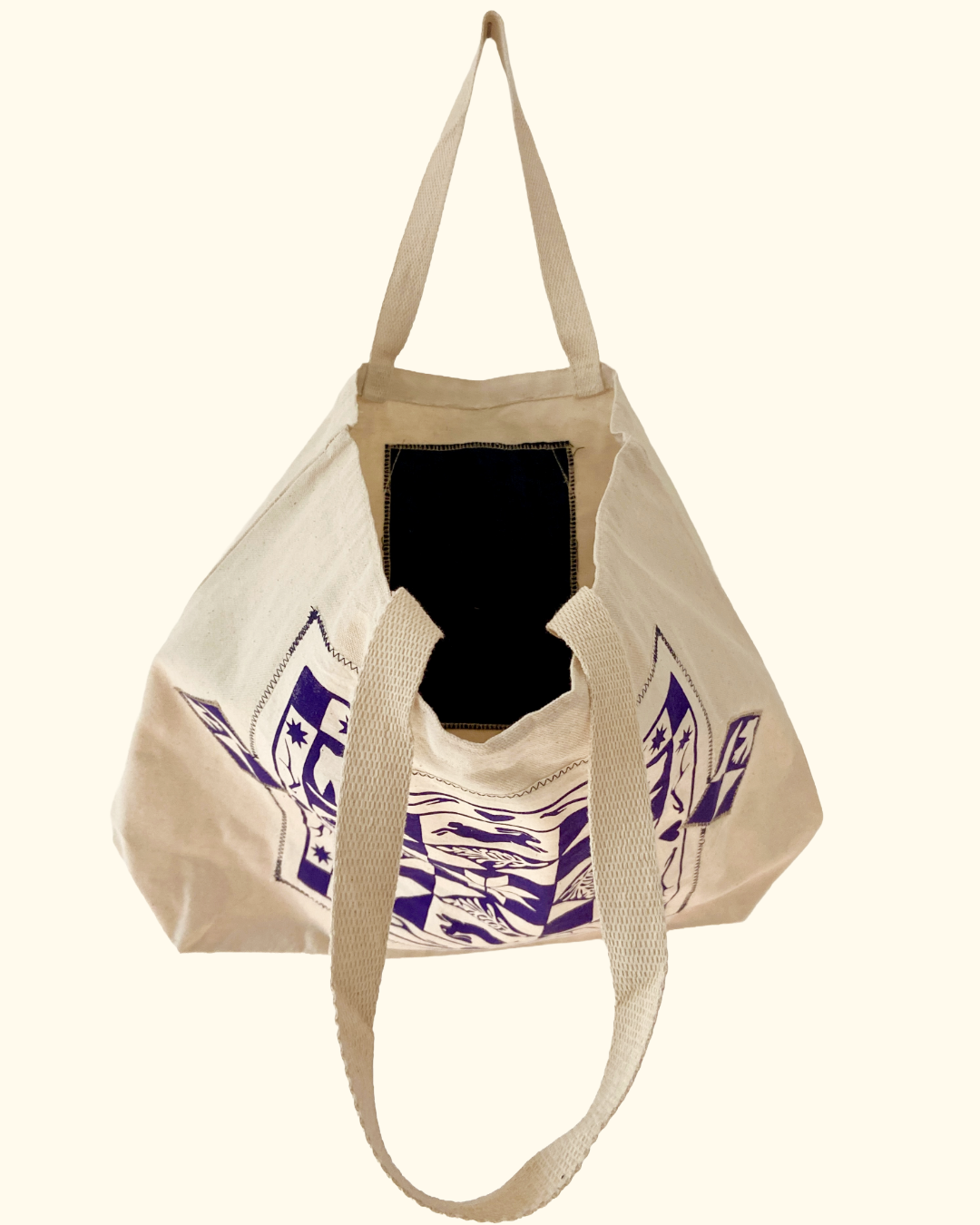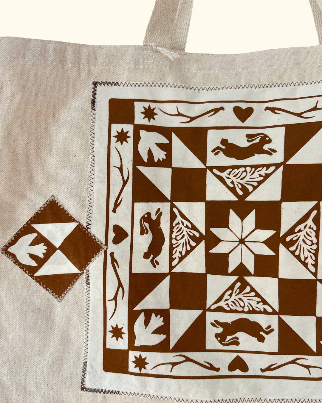 This one-of-a-kind upcycled tote bag features a screen-printed quiltwork design inspired by winter. The durable canvas tote bag offers ample space and has an added inside pocket to easily store your phone/wallet. The tote and patches are made from 100% cotton fabric and all designs are hand printed with high-quality washable ink. Care instructions are included with each product.
