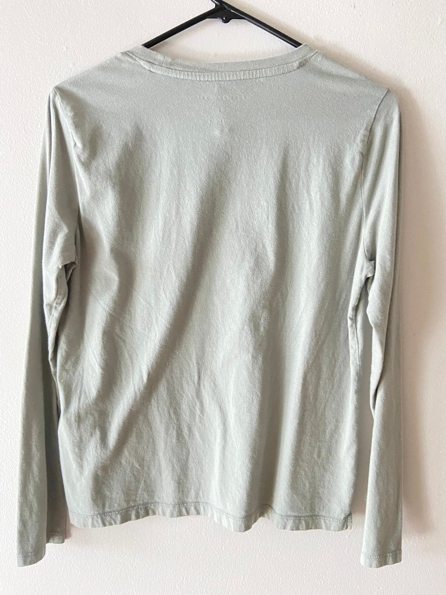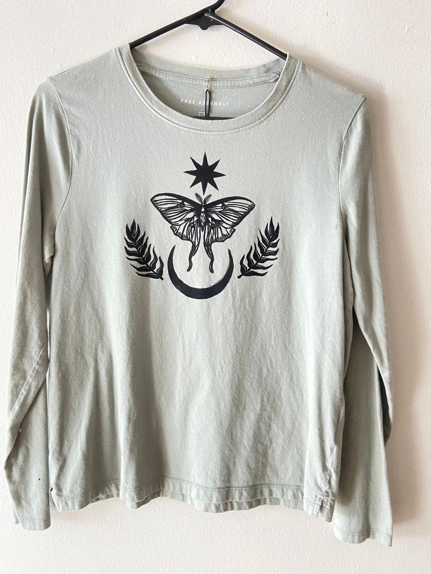 Muted sage color long sleeve stretch shirt featuring a luna moth design block printed in black ink. All designs are stamped with high quality washable ink and care instructions are included with each item.
