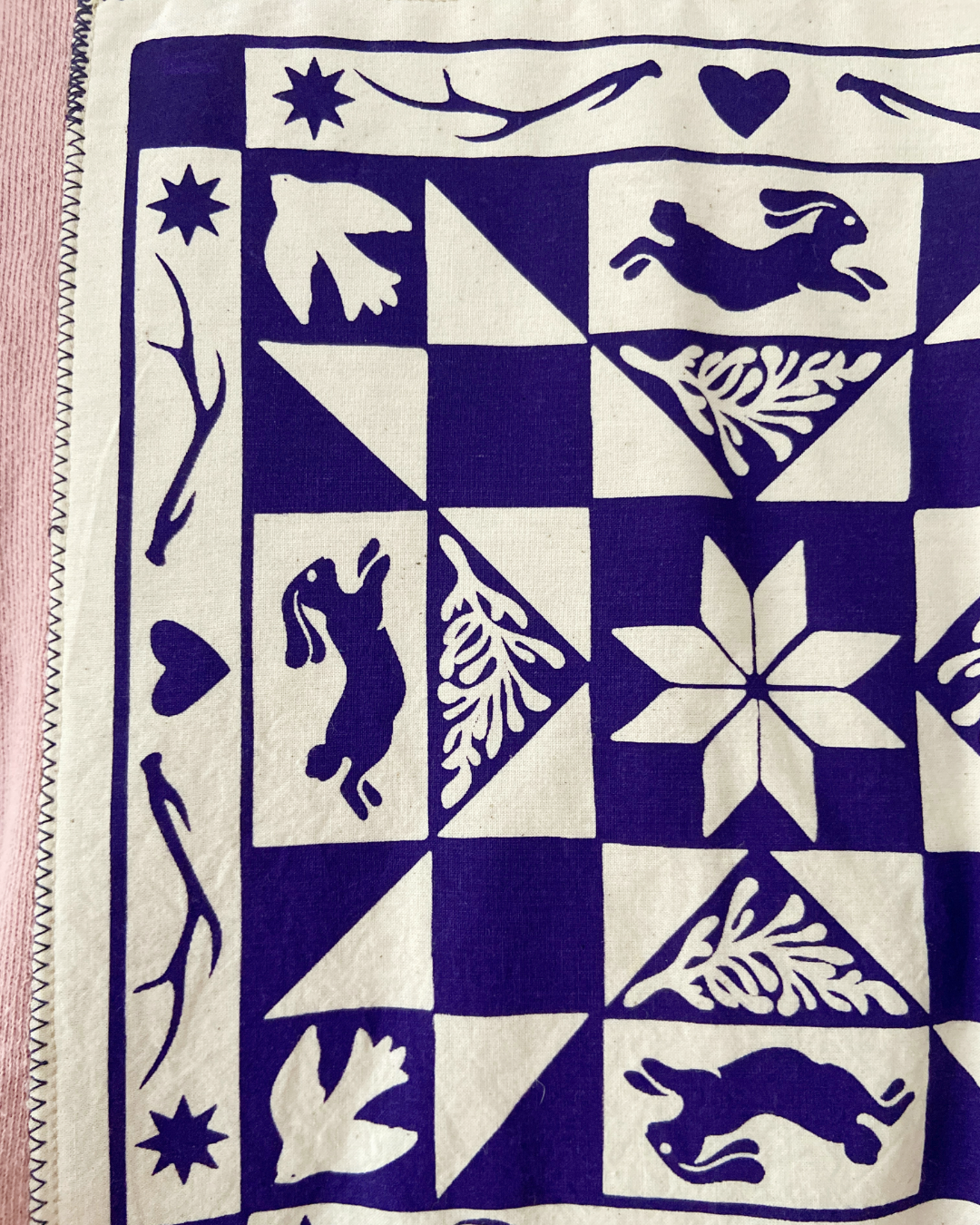 Light pink crewneck sweatshirt featuring a purple screen-printed quilt design inspired by winter.