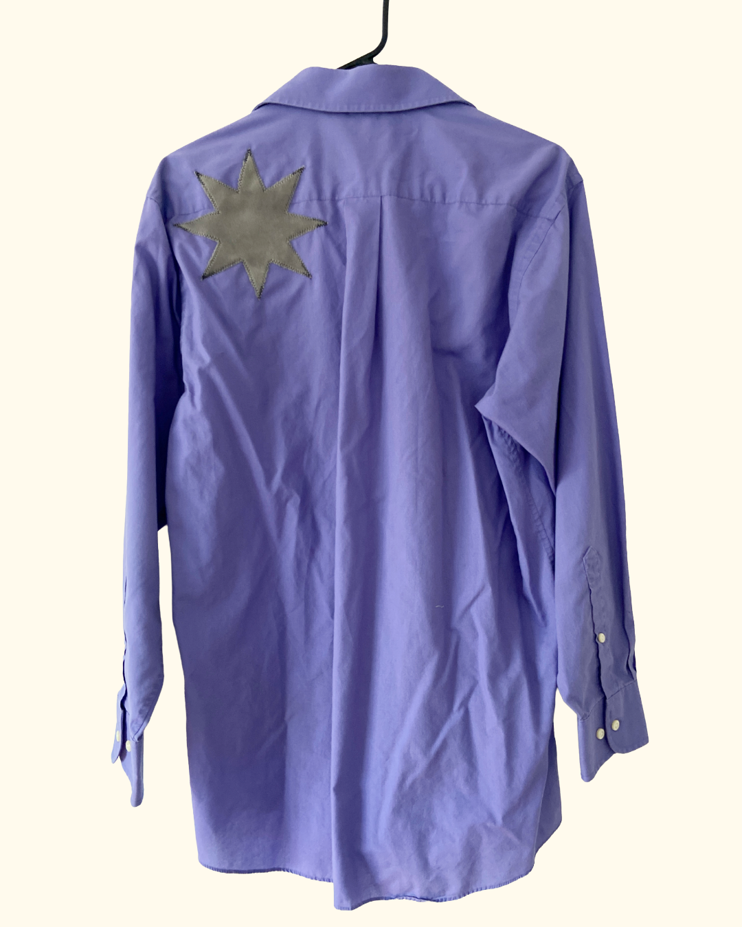 Bold purple button-down shirt featuring a block-printed luna moth patch and appliqué star and moon motifs.