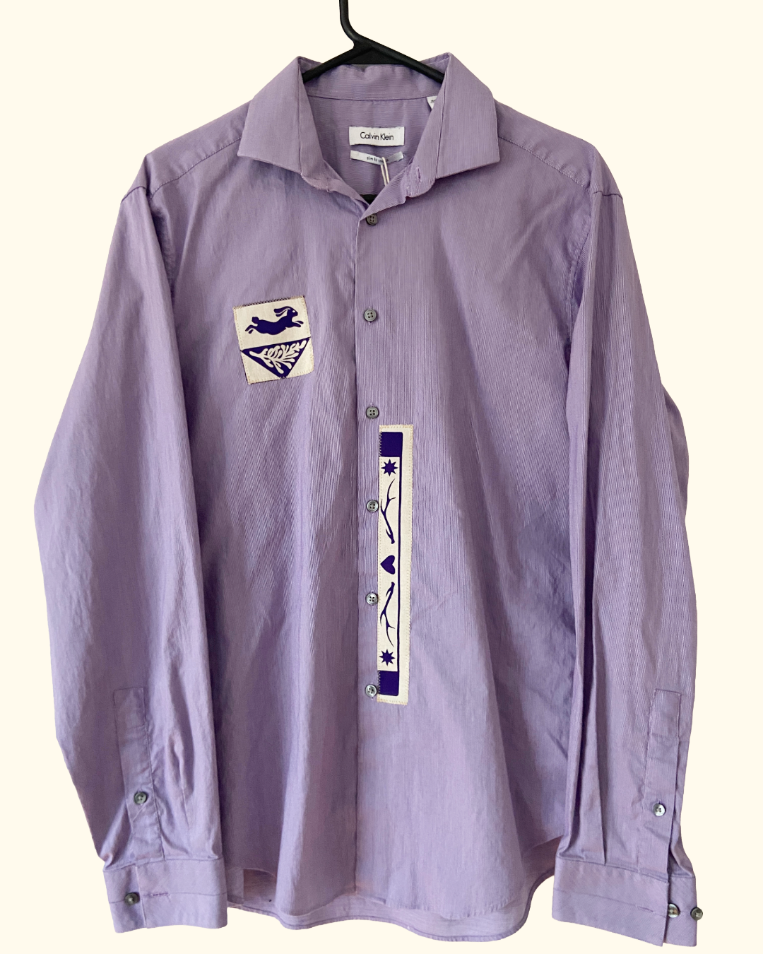 Light purple button-down shirt featuring screen-printed quilt designs inspired by winter.