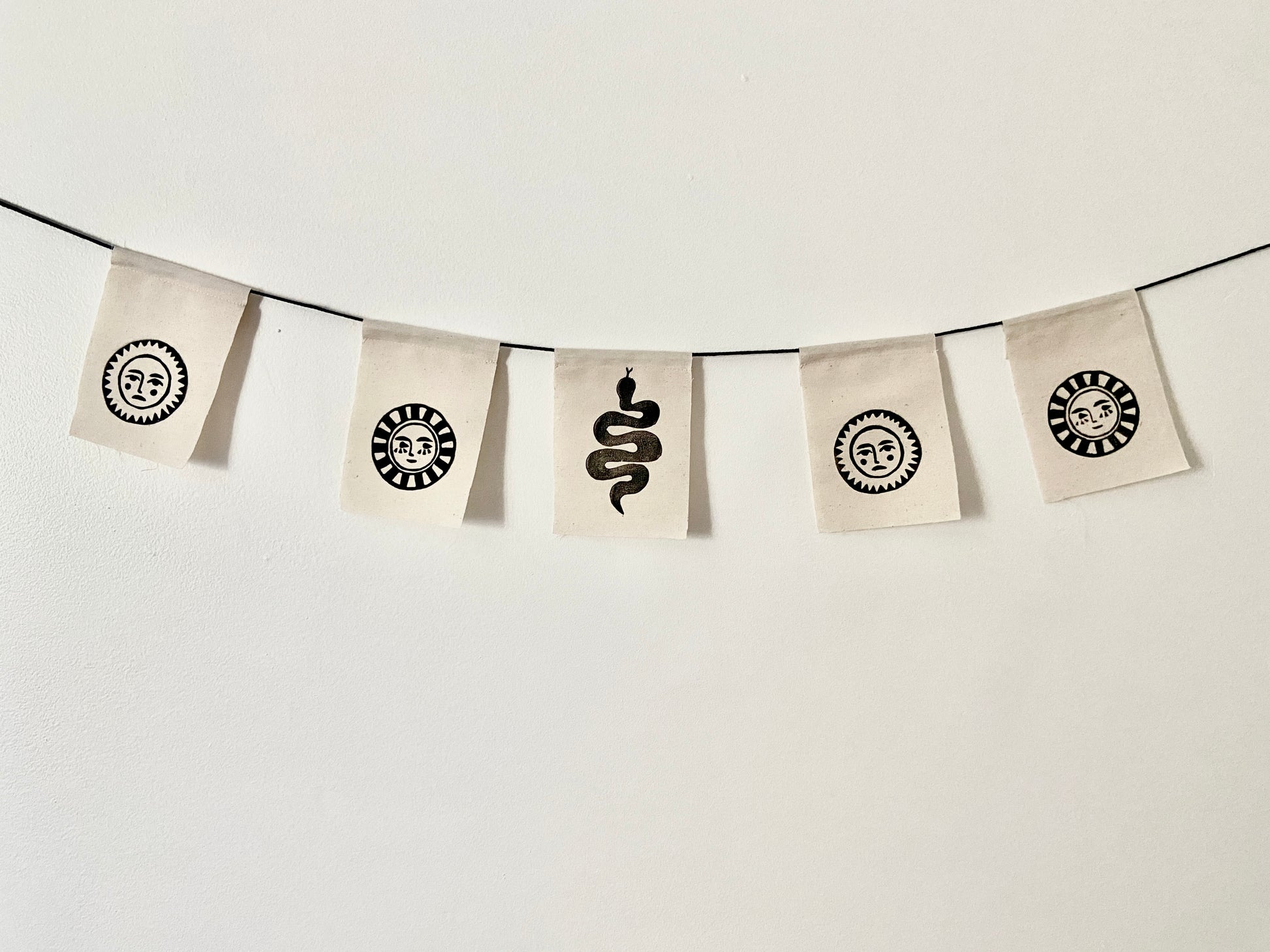 This hand-printed string of flags features two sets of sunshines and a snake block printed with black ink on a natural muslin fabric that does not fray. The flags hang on black cotton string.