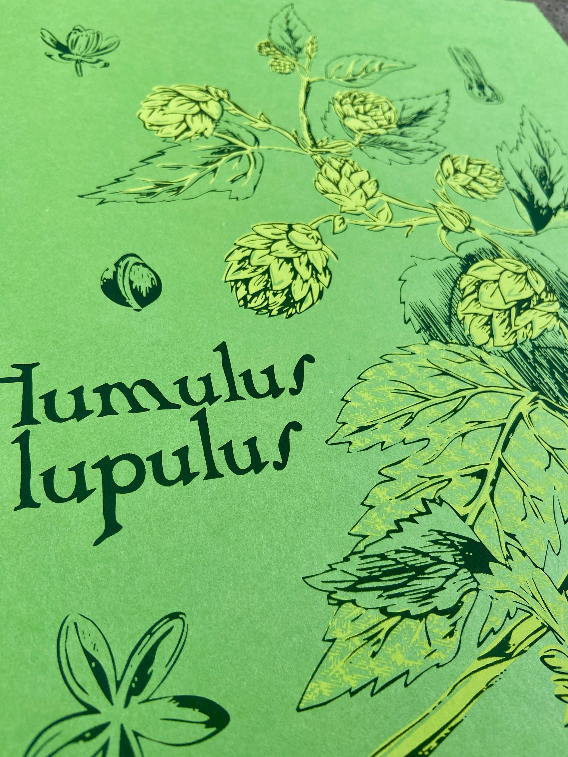 This limited edition (20) screen print features a hop plant in all its beautiful splendor. The design is hand-printed using two colors with high-quality water-based ink on acid-free green paper.