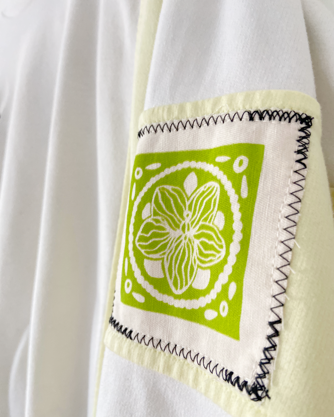 White and bright yellow vintage crewneck sweatshirt featuring bright green hand-printed patches on the front and left sleeve.