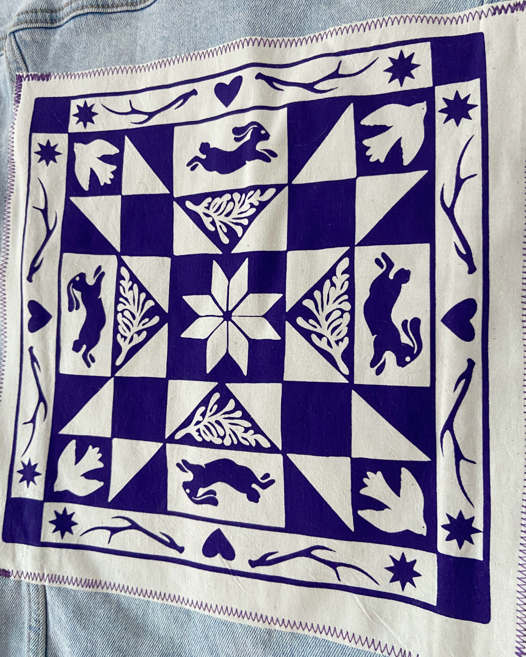 Light denim jacket featuring screen-printed quilt designs inspired by winter.